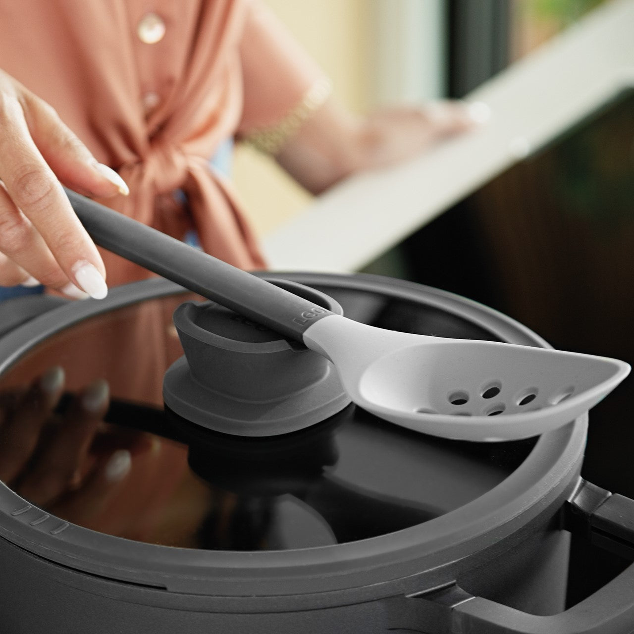Speciaal handvat op het deksel waarop u een lepel kunt leggen