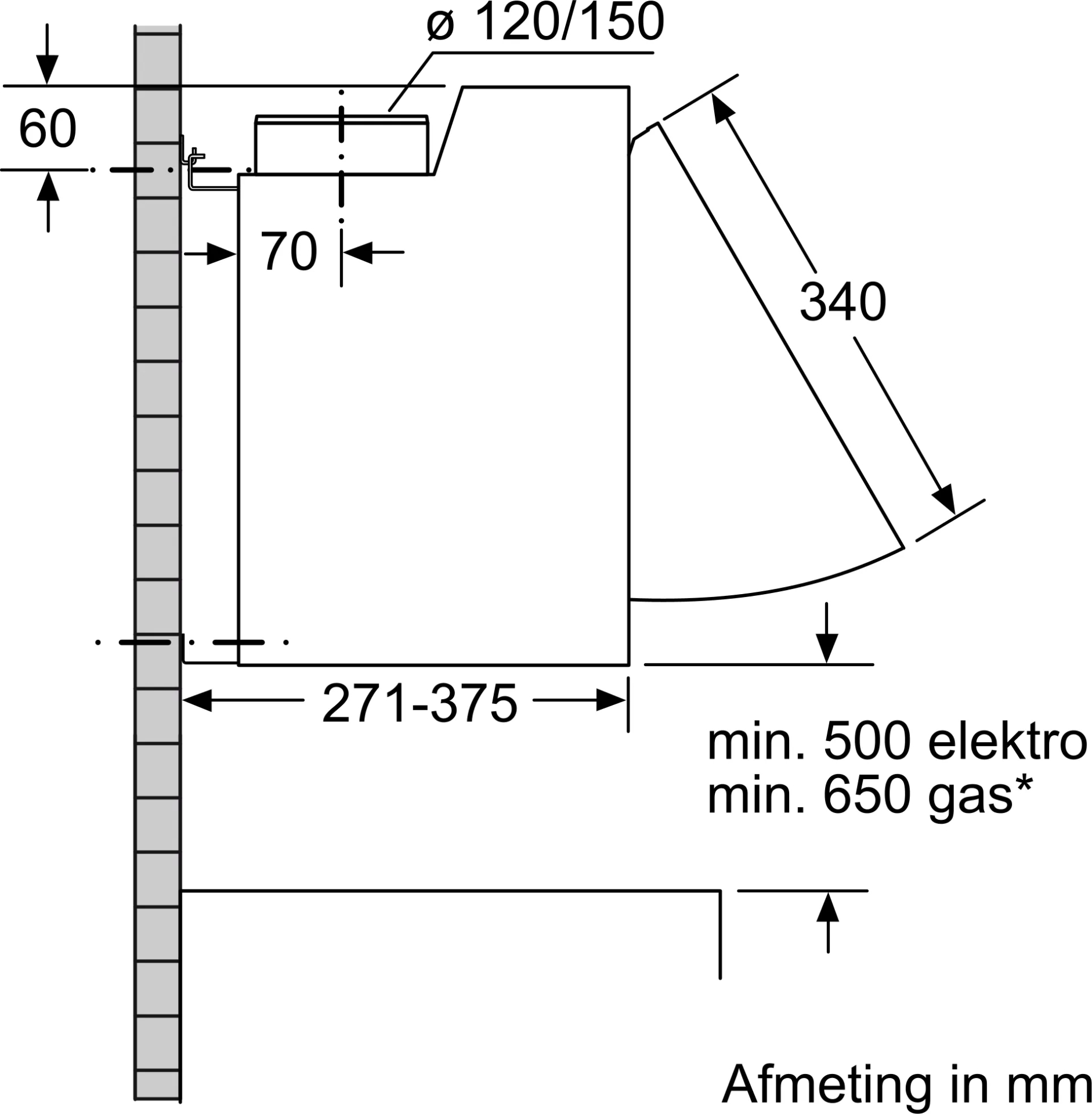 Aanbevolen diameter van het luchtafvoerkanaal voor een optimale werking van de dampkap: Ø 150 mm (120 mm met het toestel meegeleverd)