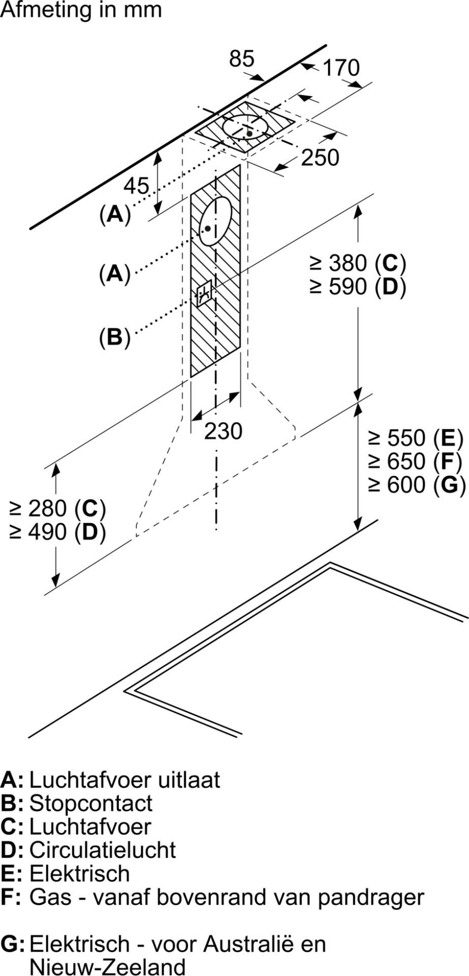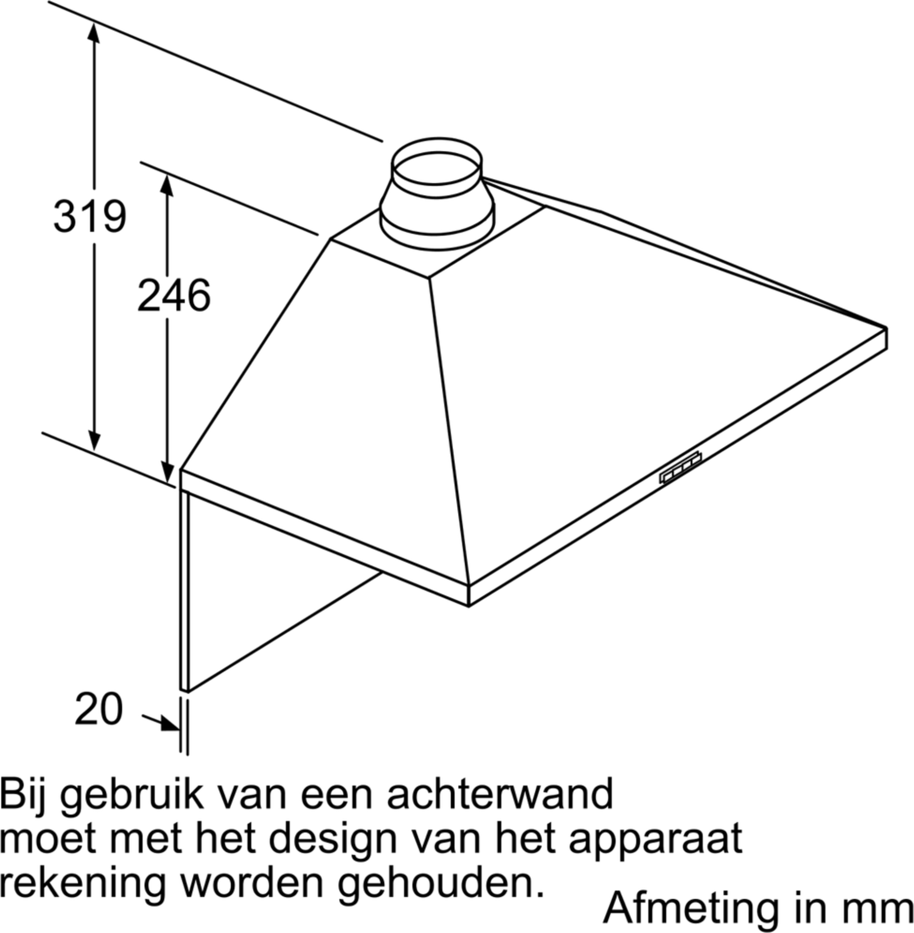 Toestelafmetingen bij luchtafvoer (HxBxD): 799-975 x 600 x 500 mm