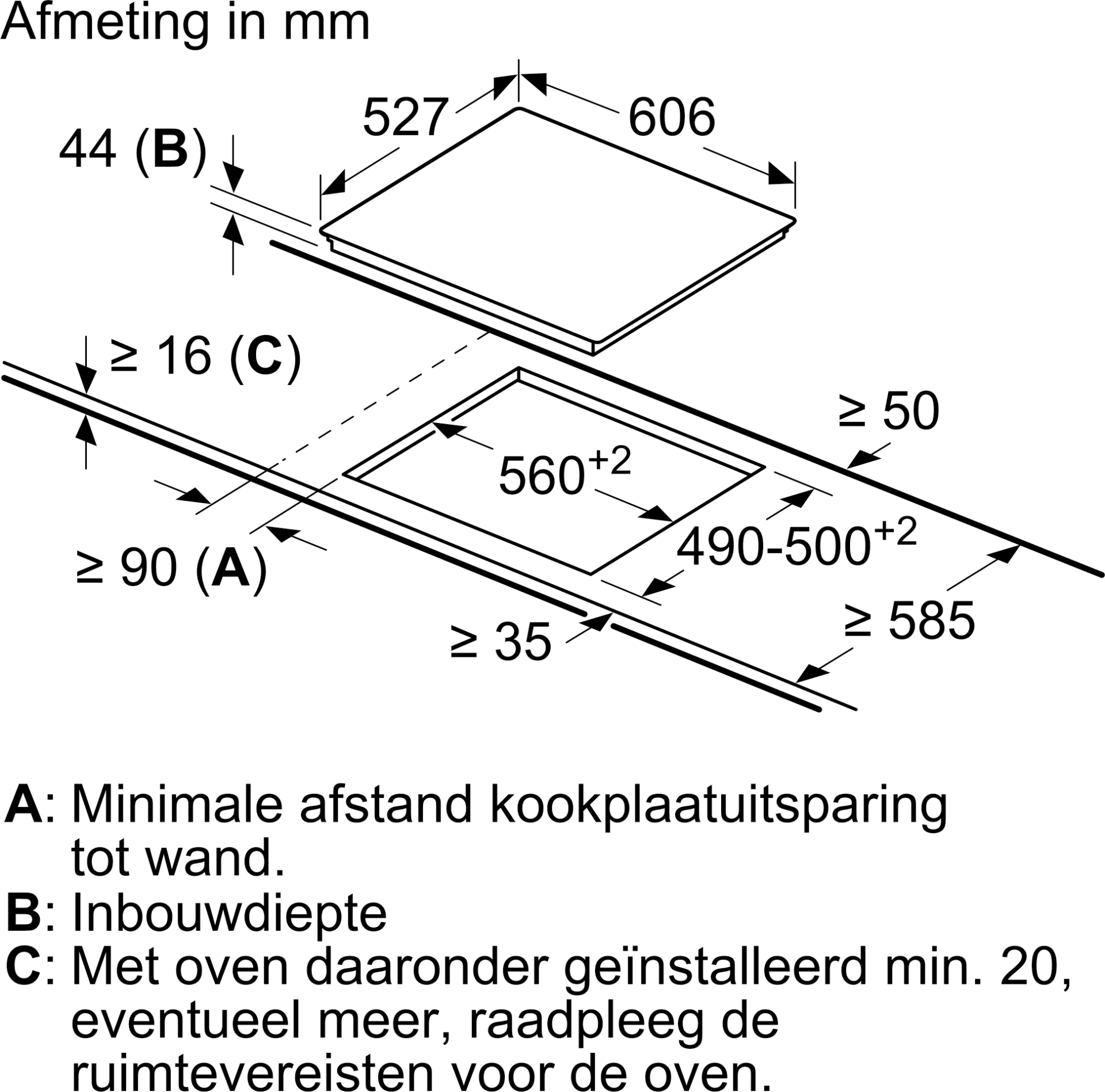 Inbouwafmetingen : 44 x 560-560 x 490-500 mm
