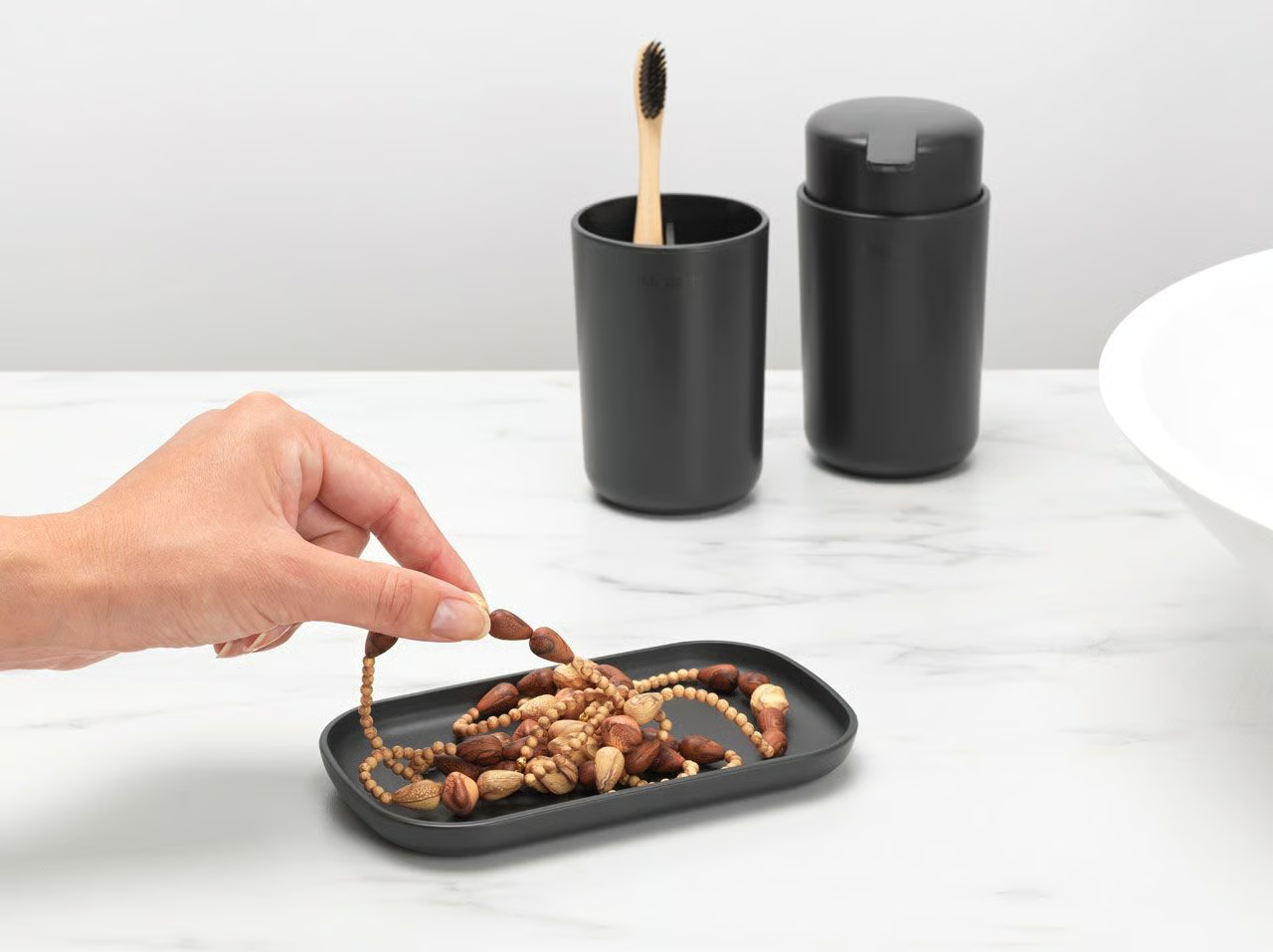 Compleet - set van zeeppomp, tandenborstelhouder en een schaal.
