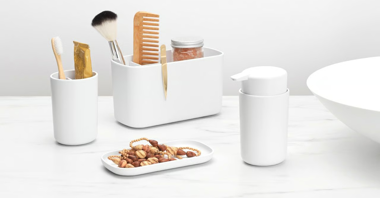 Compleet - set van zeeppomp, tandenborstelhouder en een schaal.