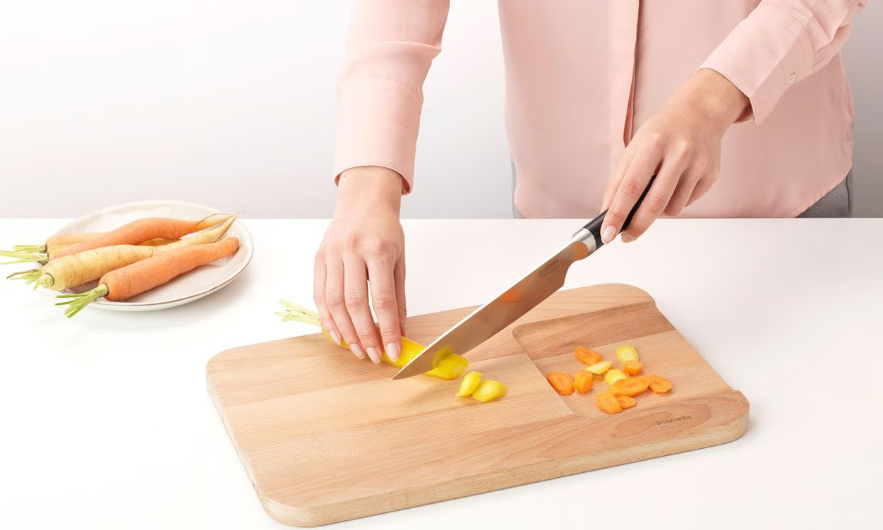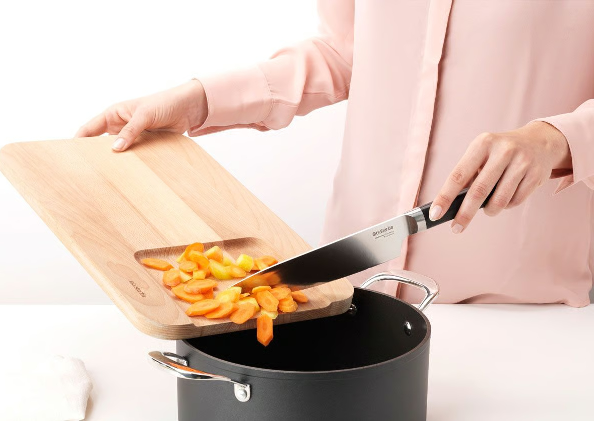 Geen geknoei - dankzij lager en smaller stuk schuif je groenten zó in de pan.