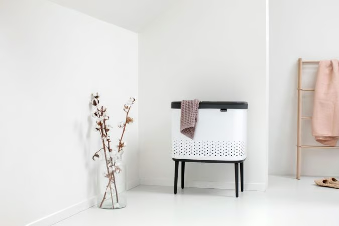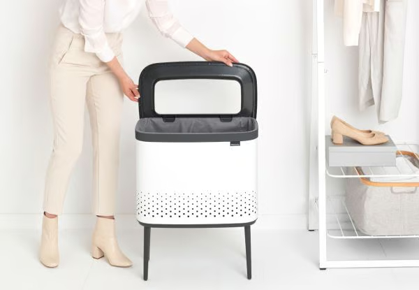 Handen vrij - zet het deksel op de rand als je wasgoed in de mand stopt of eruithaalt.