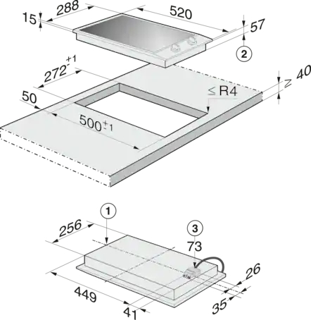 Afmetingen uitsparing in mm (diepte) bij aansluitende inbouw 500