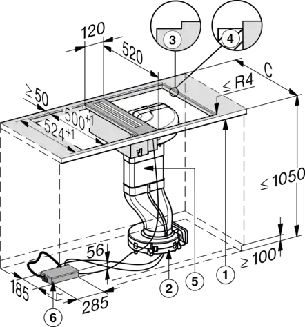 Afmetingen uitsparing in mm (diepte) bij aansluitende inbouw: 500