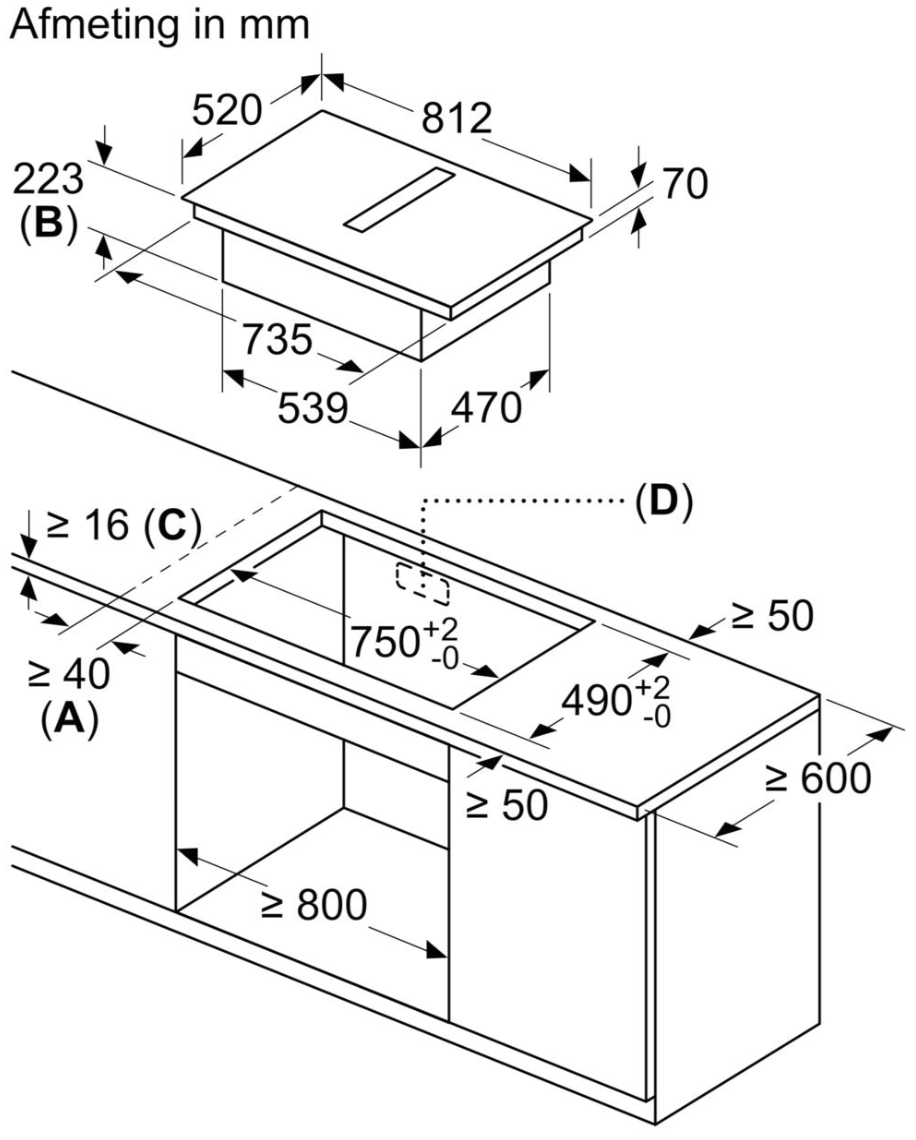 Inbouwafmetingen (HxBxD) : 223 x 750 x (490 - 490)