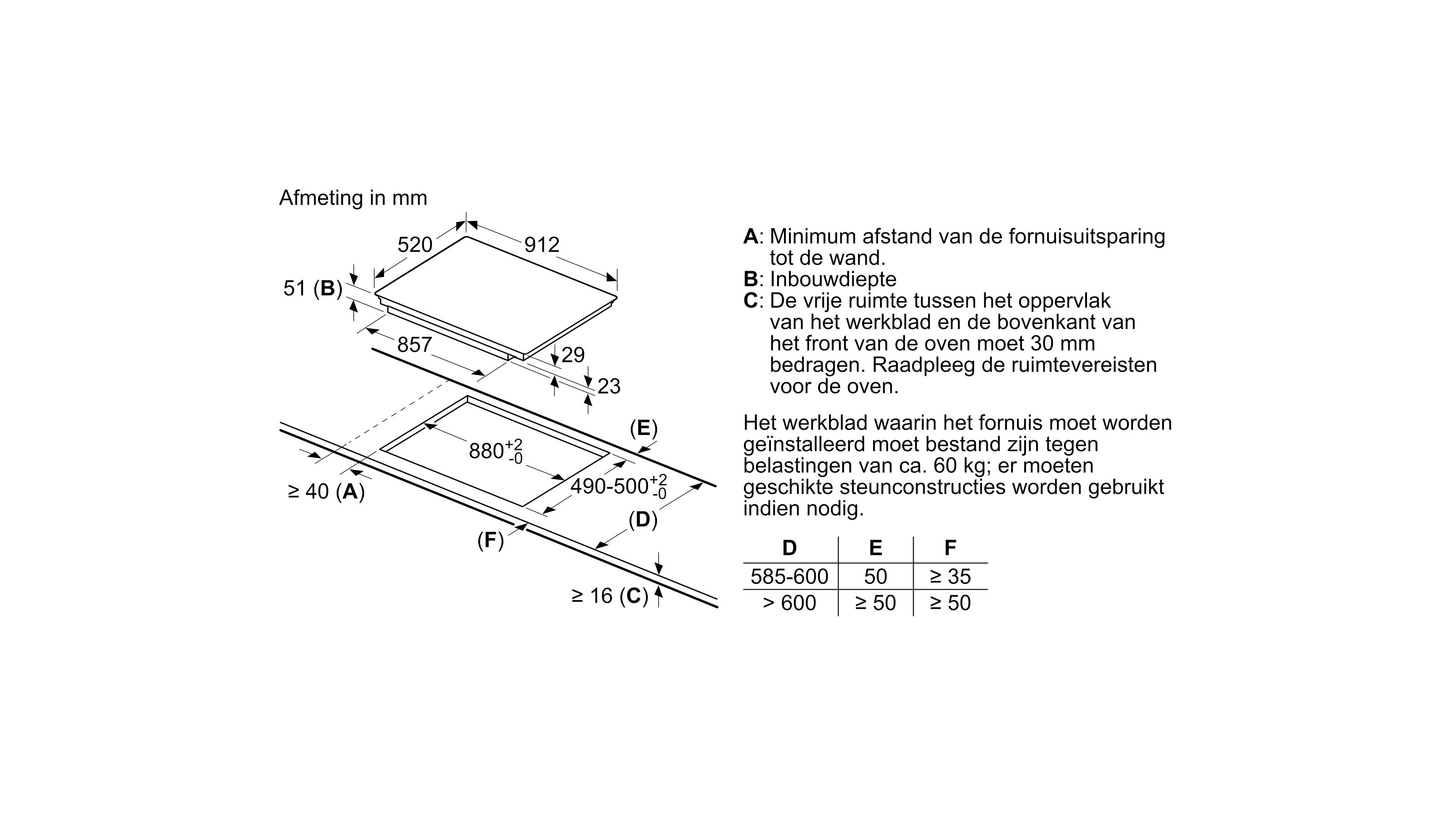 Inbouwafmetingen (HxBxD): 51 x 880-880 x 490-500 mm