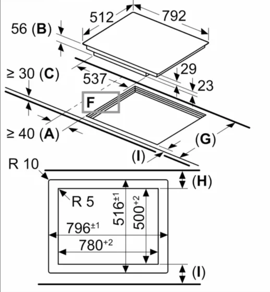 Kookzone linksachter: 200 mm, 230 mm, 2.2 kW (max. 3.7 kW)