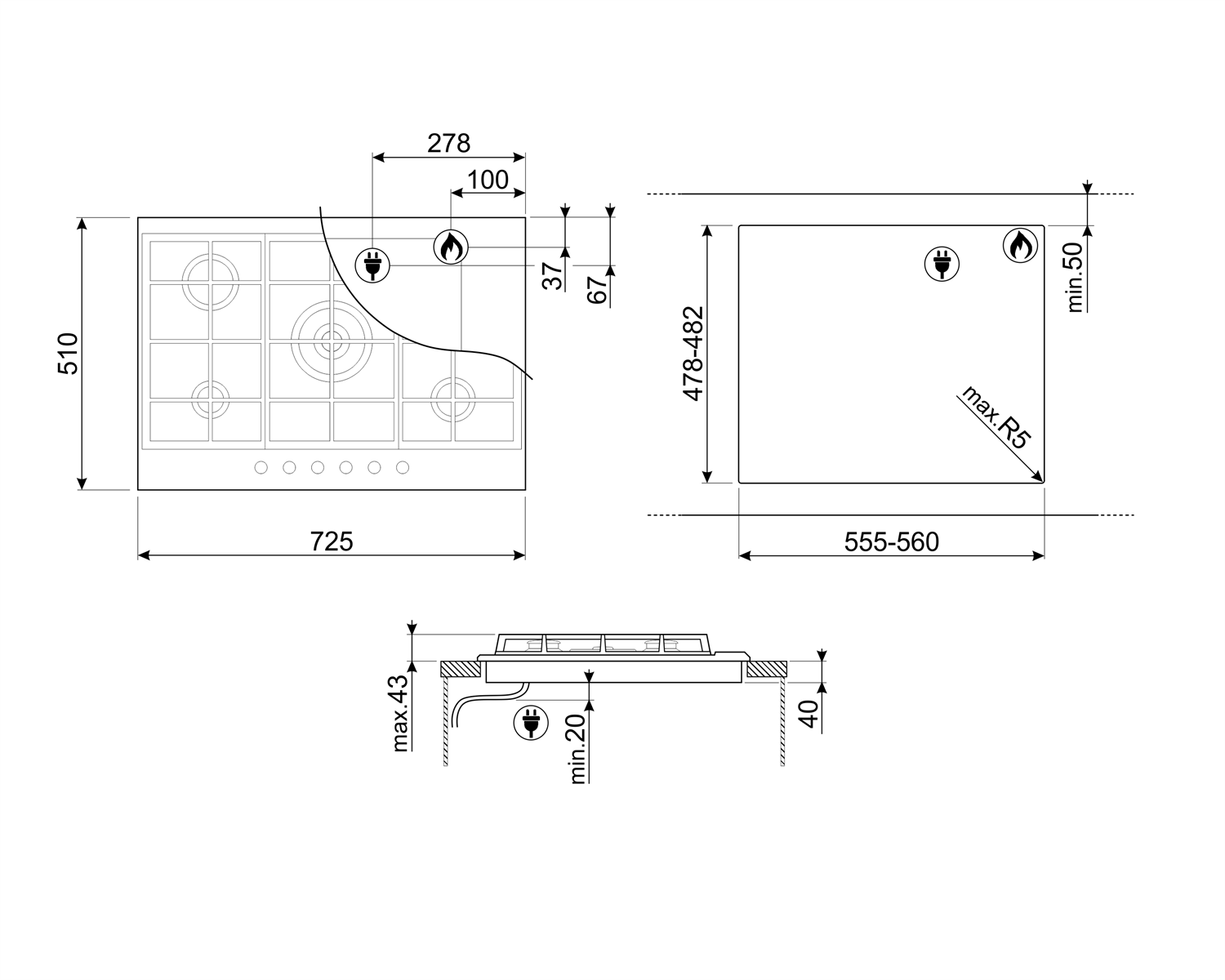 SMEG P272XGH gaskookplaat - 72cm