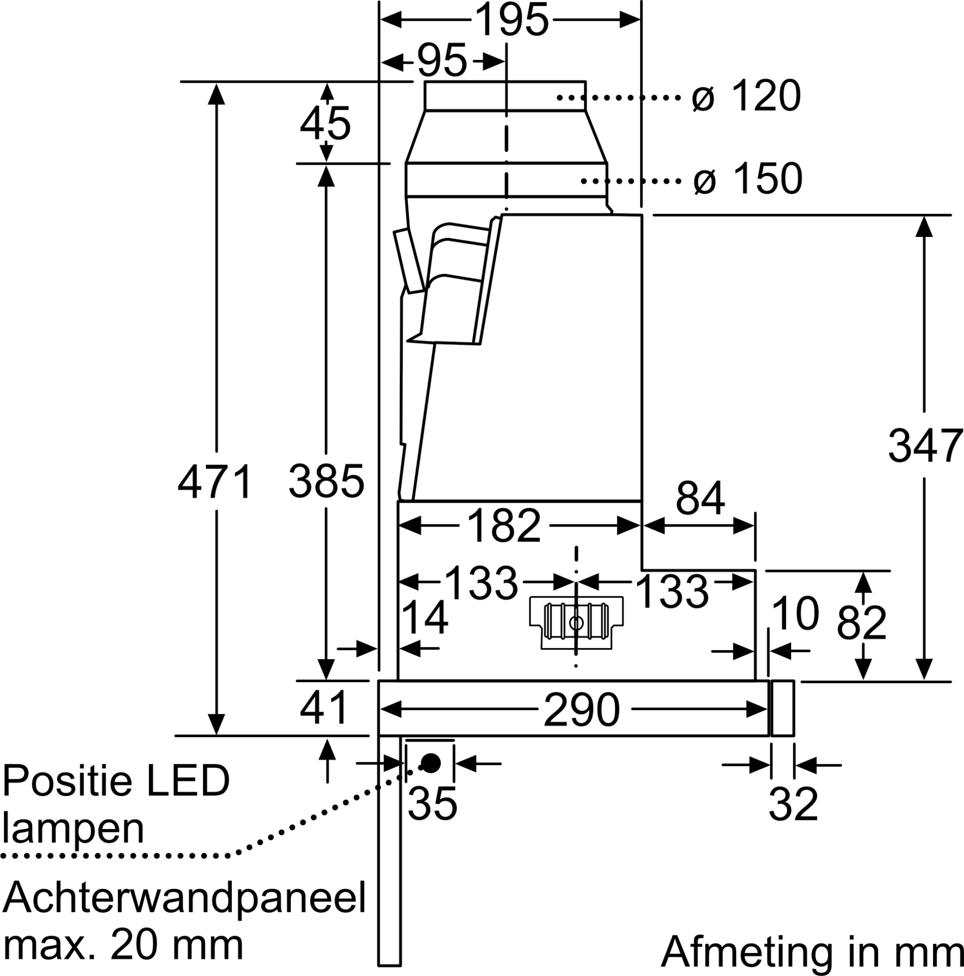Aanbevolen diameter afvoerkanaal Ø 150 mm (Ø 120 mm bijgeleverd)