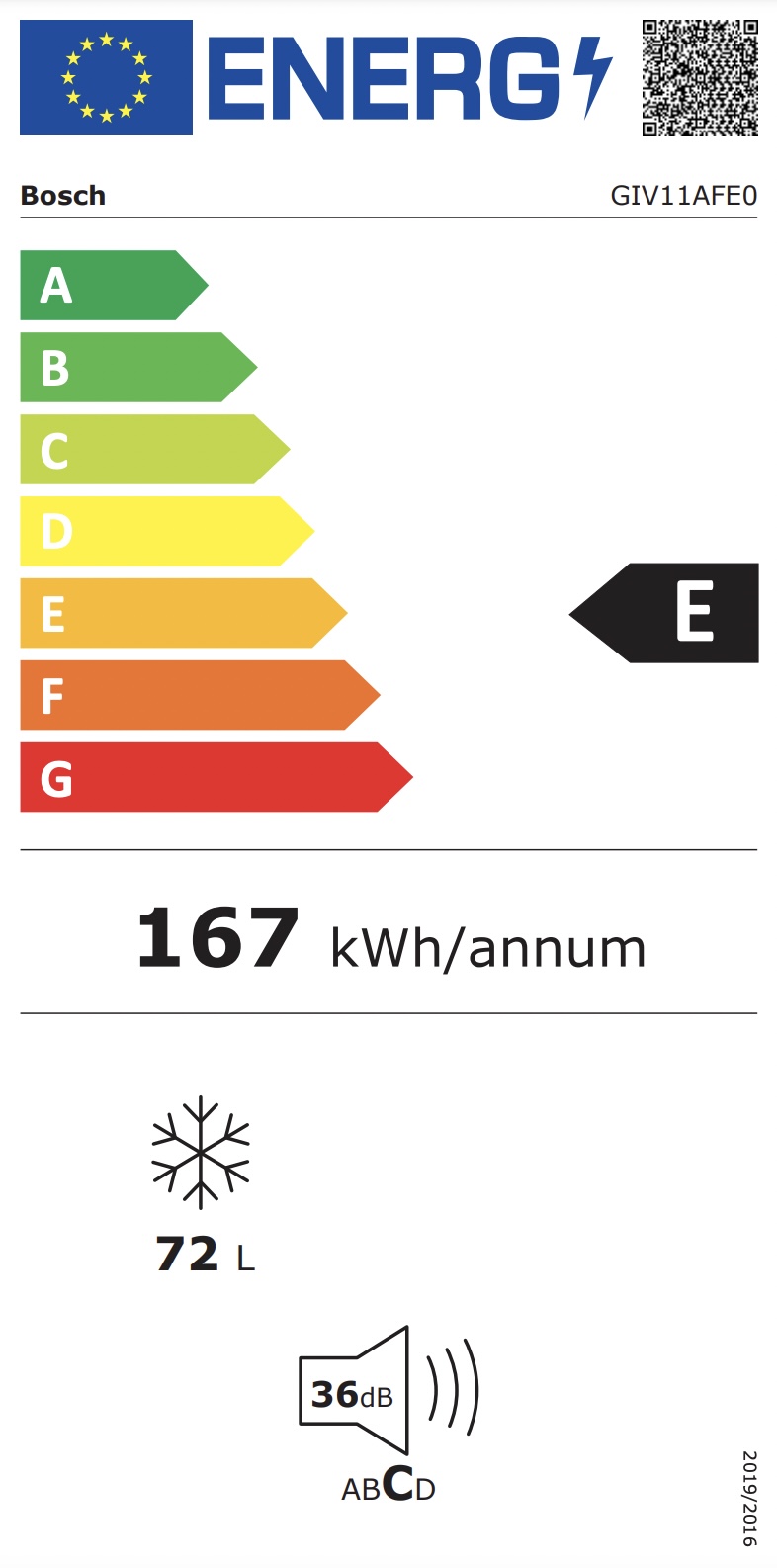 E • low frost • 55 cm breed • Vriezer nis 72 cm • stil (≤ 39 dB) • 3 lades • omkeerbare scharnierVermogen / VerbruikTotale netto-inhoud: 72 lGeluidsniveau: 36 dB(A) re 1 pWUitrustingVaste deurComfort en veiligheidlowFrost - minder ijsvo…
