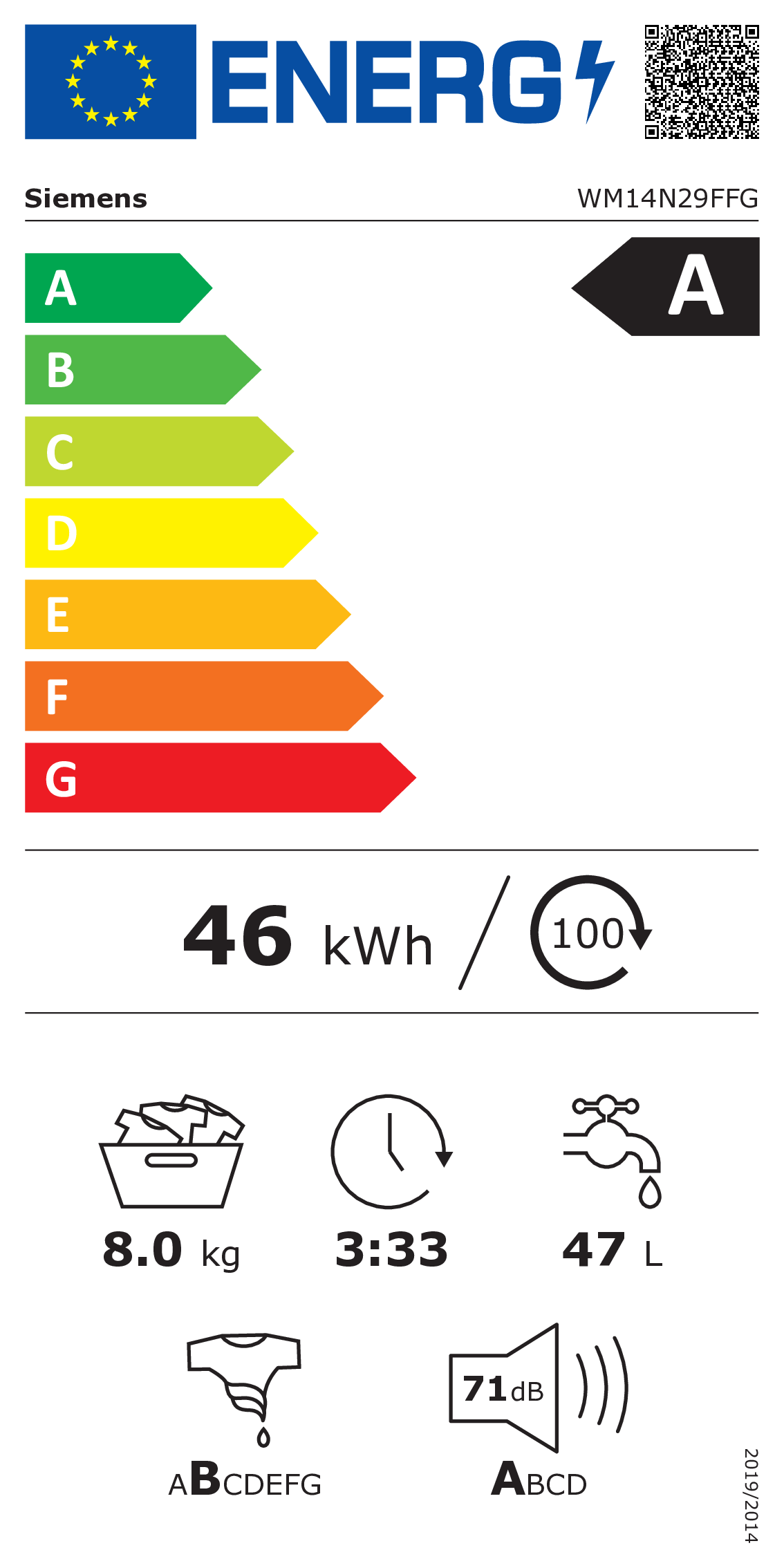 met delicate stoffen programma • inductie • 1400 tr/min • B • met startuitstel • wassen aan lage temperatuur mogelijk • A • Wasmachine • 8 kg • met stoomfunctieALGEMENE INFORMATIEEnergie efficiëntieklasse¹: AEnergie² / Water³: 46 kWu / 47 literInhoud: 1 - 8 kgProgrammaduur⁴: 3:33 u:minDroogefficiën…