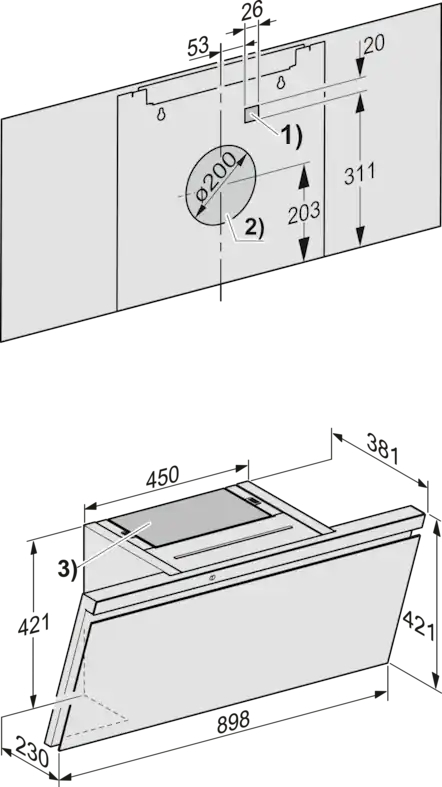 Totale hoogte dampkap luchtafvoersysteem en externe ventilator min. in mm 830