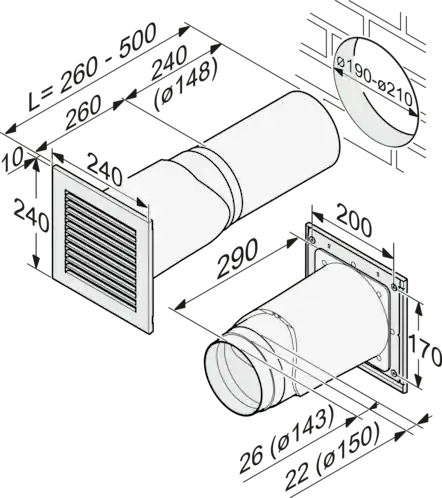 Muurkast, Ø 150 mm, voor luchtafvoer van dampkappen
