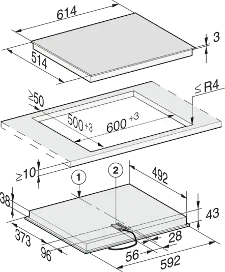 Afmetingen uitsparing in mm (diepte) bij aansluitende inbouw: 500