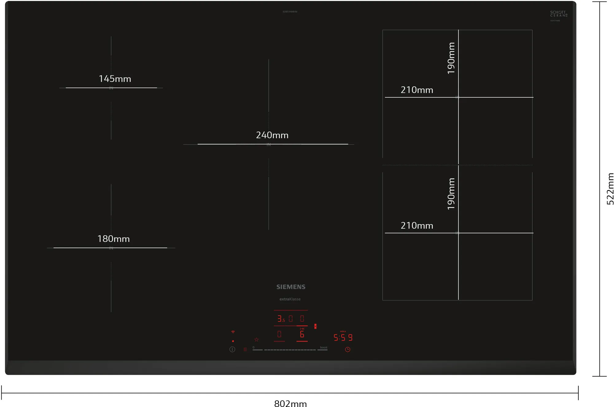 Kookzone rechtsachter: 190 mm, 210 mm , 2.5 kW (max. 3.7 kW)