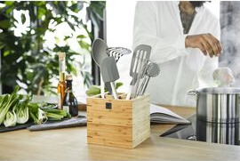 Elke keuken heeft nood aan orde en de belangrijkste keukenhulpjes heb je graag steeds bij de hand. De keukenhulphouder van 11 x 15 cm van Staub biedt je de nodige hulp. Het tijdloze design zal je zeker en vast ook overtuigen. De bodem binnenin wordt beschermd door een siliconen matje zodat de keukenhulpjes de bodem niet beschadigen bij het opbergen.